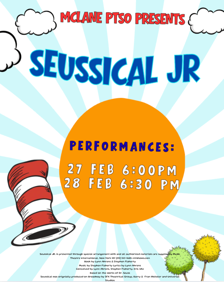 This year McLane PTSO is partnered with Mrs. Stacey Burns, our McLane Music Teacher and experienced theater/drama educator, and Mrs. Katelyn May, an experienced youth theater program director with many youth theater shows on her resume as well as teacher-in-training credentials! The PTSO Theater Committee – Stacey, Katelyn, Nadine, Kristen and Jo – have been meeting biweekly since the start of the school year to prep and plan for this amazing event – Suessical Jr.!